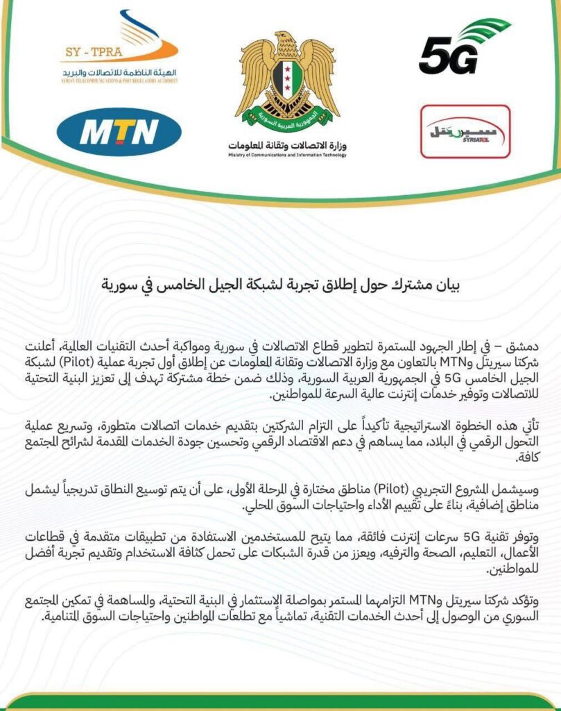أُطلقت أول تجربة عملية (Pilot) لشبكة الجيل الخامس 5G في سوريا، بالتعاون مع شركتي سيريتل وMTN.